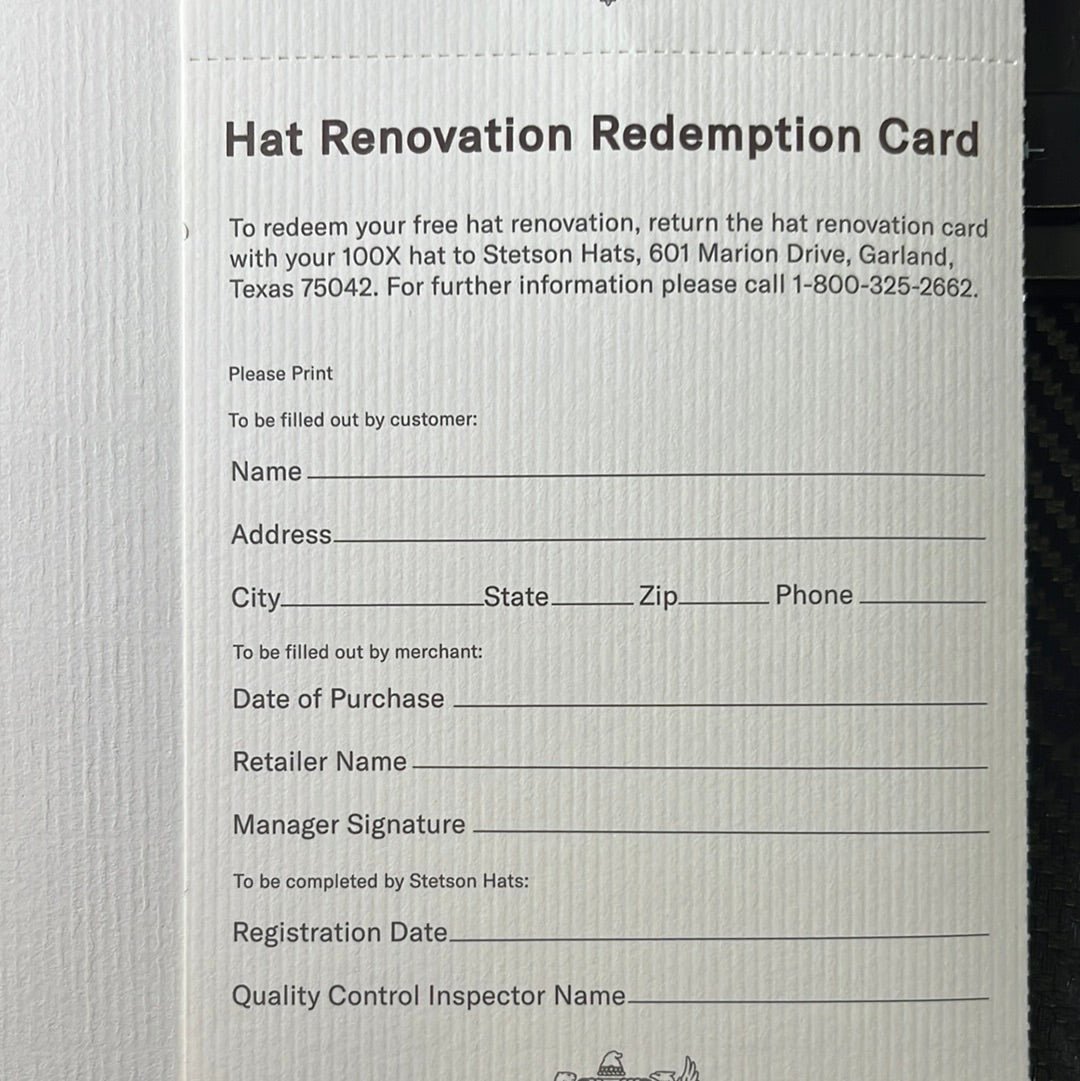 To keep perspiration from penetrating the fur felt, occasionally turn down the leather sweatband so it can dry out. -Should your hat, (if it is light colored) become spotted with water or grease, you can clean it with a little baby talc or corn starch - not liquid cleanser, please!