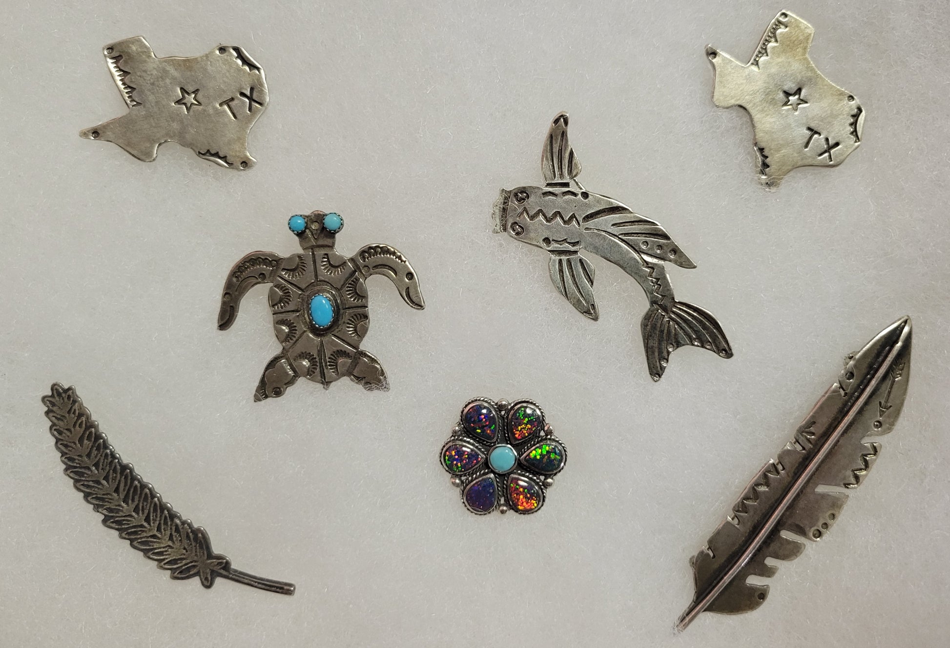These hand crafted Peyote Bird sterling silver hat pins are a perfect addition to any hat, jacket, or bag. These one of a kind pins come in all shapes and sizes. Sometimes we need something different that speaks to us as individuals. Whether you want to rep your local state, good ole Texas, or just love turtles. Any of these will be a great addition to your collection.