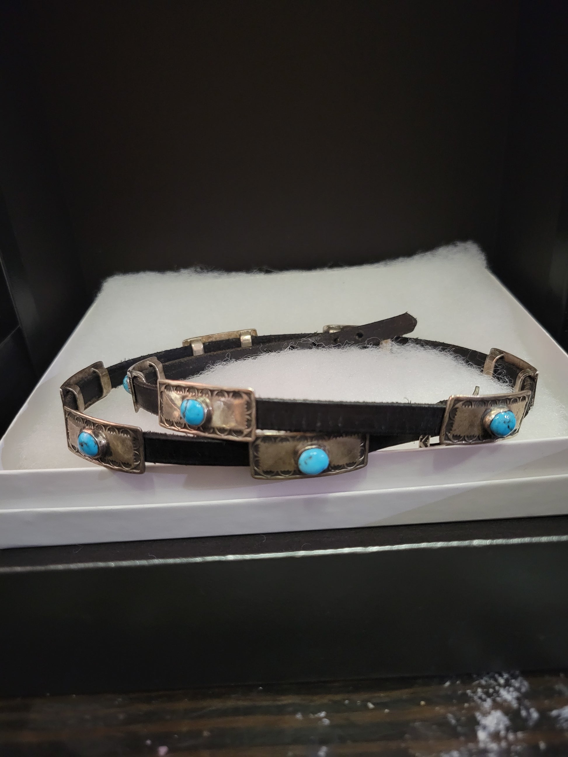 There are 9 stunning sterling silver plates with a turquoise inlay through the length of the hat band. Each sterling silver plate is 1 1/4" in length and 1/2" wide.
