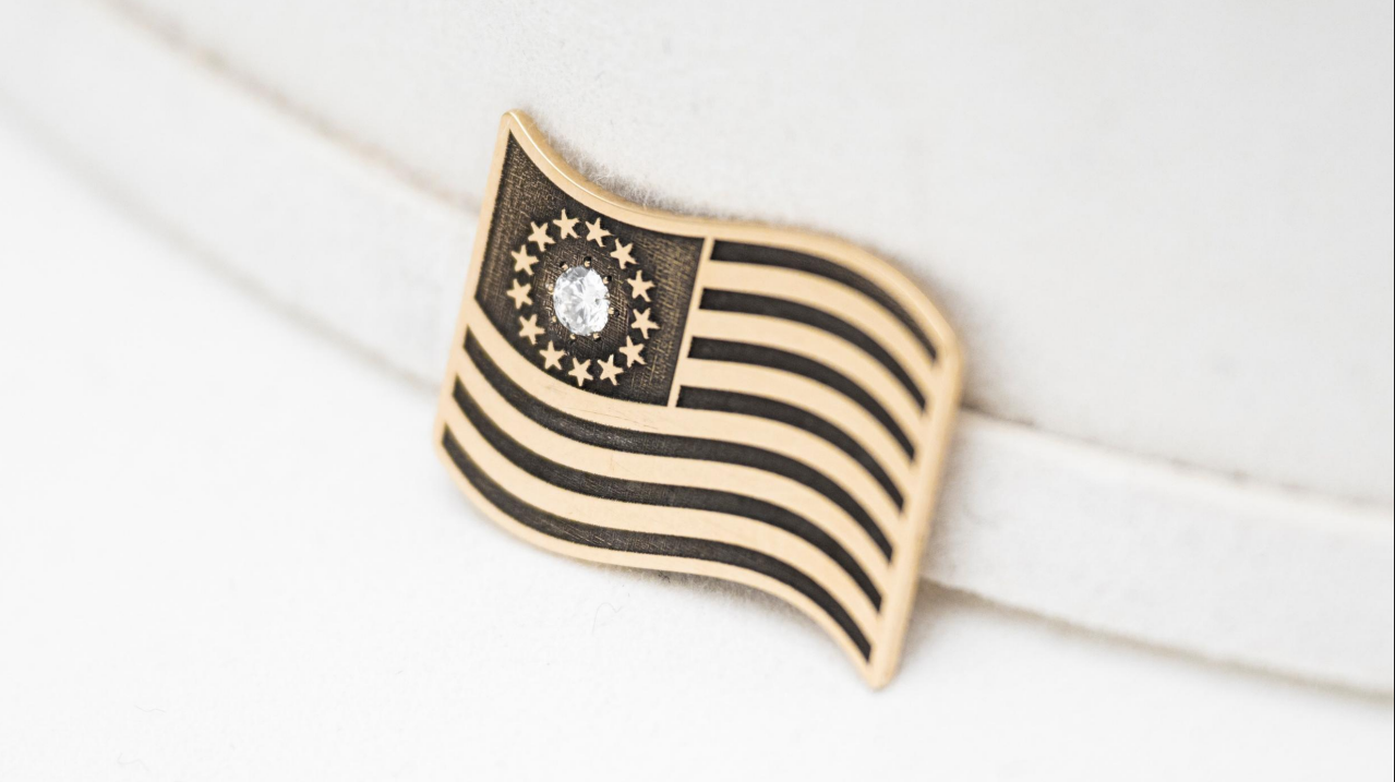 Waving 1776 Flag Hat Band Buckle Concho - Crafted in celebration of America’s 250th anniversary, this 10K yellow gold waving 1776 flag hat band concho blends historical reverence with modern artistry. The flowing flag silhouette is hand-engraved in Texas and features a brilliant diamond centered among the stars—symbolizing unity, heritage, and timeless American craftsmanship.