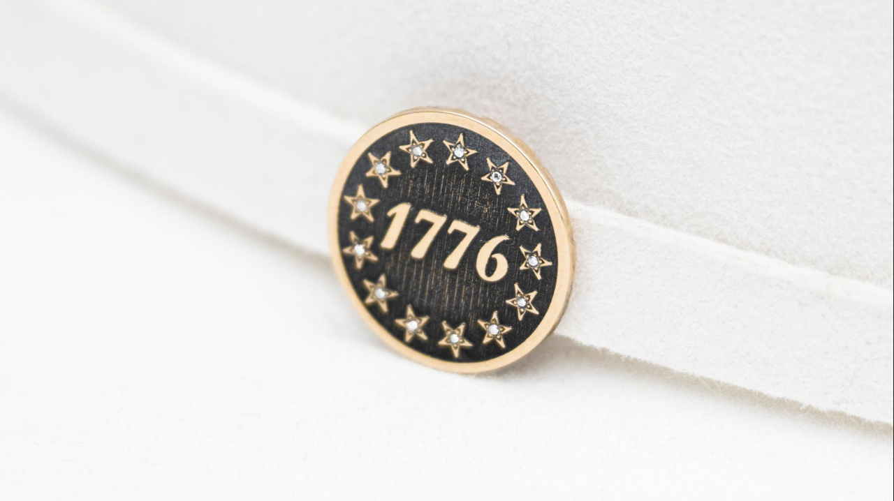 A refined tribute to the original 1776 flag, this 10K yellow gold circular hat band slider is meticulously handmade in Texas. Surrounding the design are 13 individually set diamonds, each representing one of the first colonies and forming a luminous ring of history around this heirloom-quality piece. Elegant, symbolic, and quintessentially American.