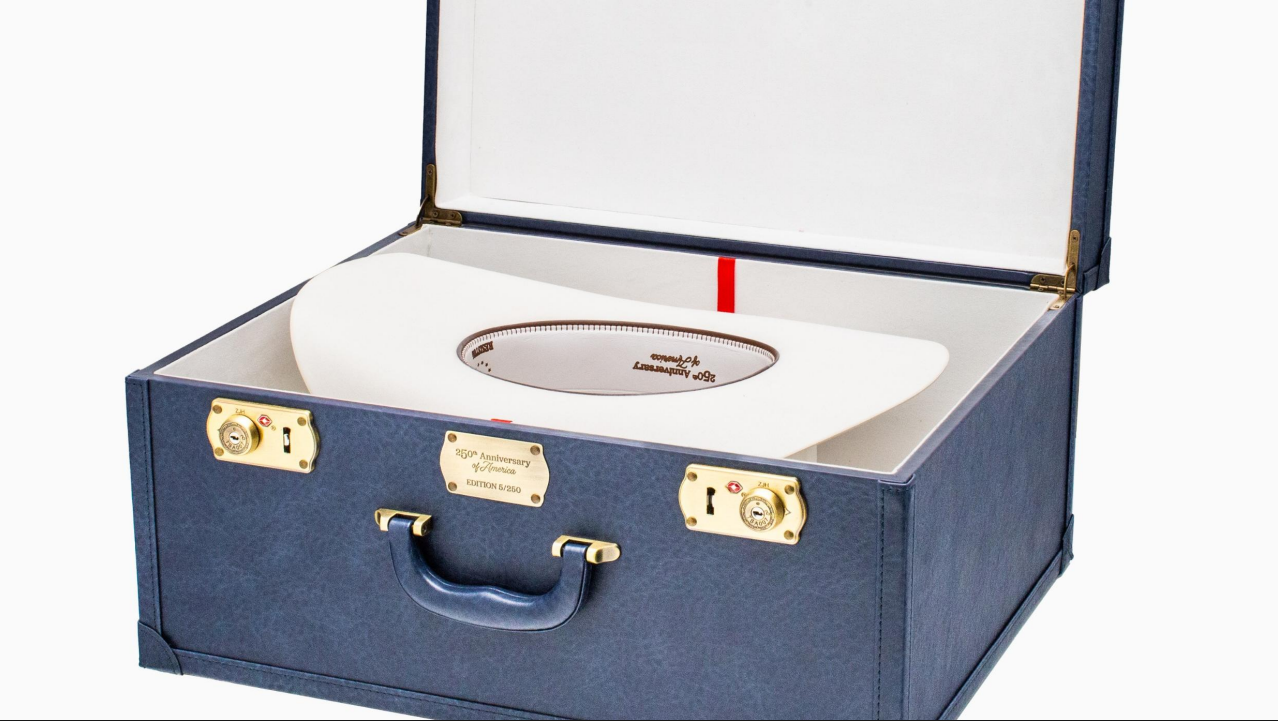 Interior liner printed with the Preamble to the United States Constitution. Each hat arrives in a custom blue-leather box with white suede lining, complete with a red bow, numbered nameplate, and certificate of authenticity