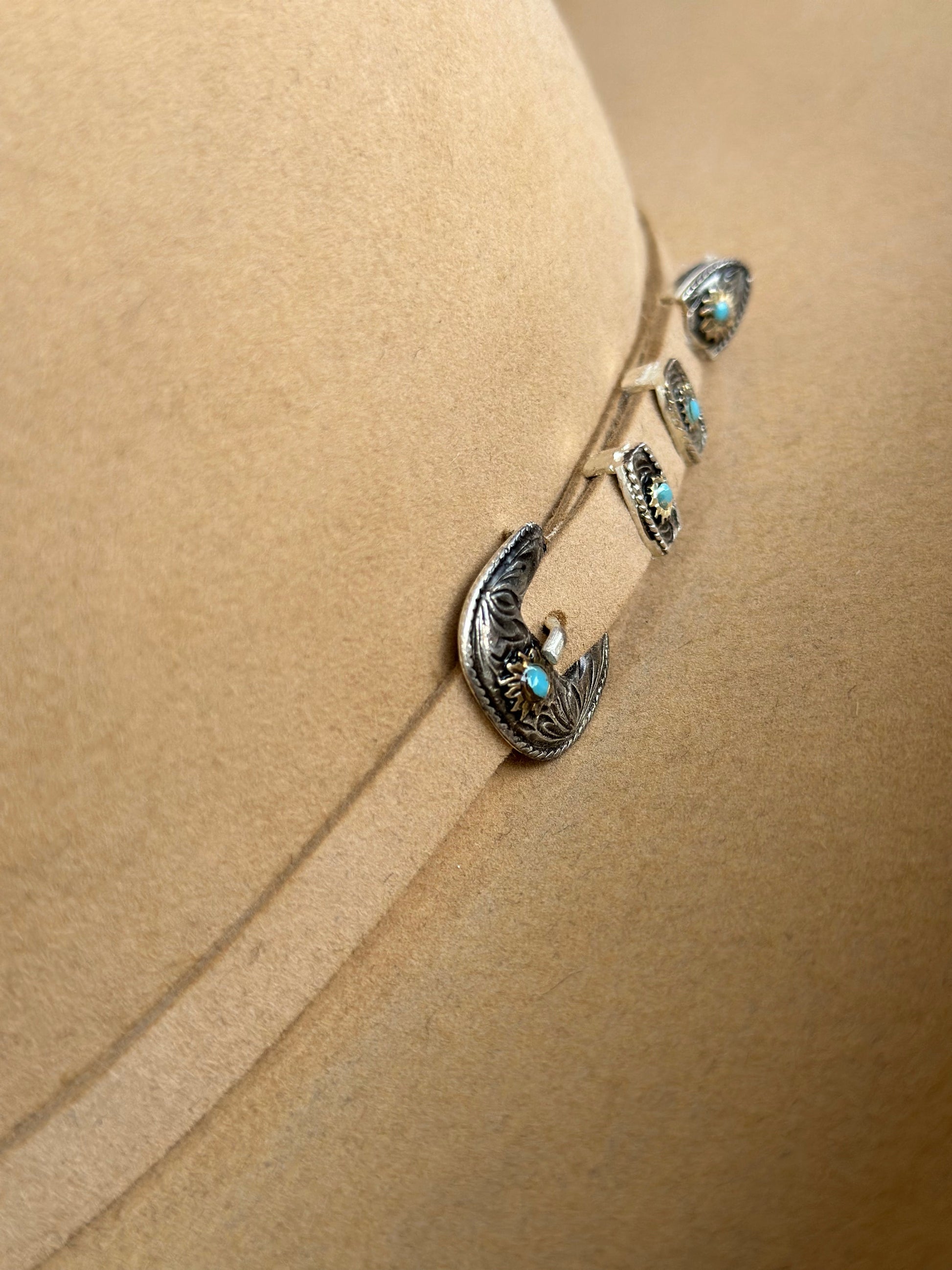 To keep perspiration from penetrating the fur felt, occasionally turn down the leather sweatband so it can dry out. -Should your hat, (if it is light colored) become spotted with water or grease, you can clean it with a little baby talc or corn starch - not liquid cleanser, please!