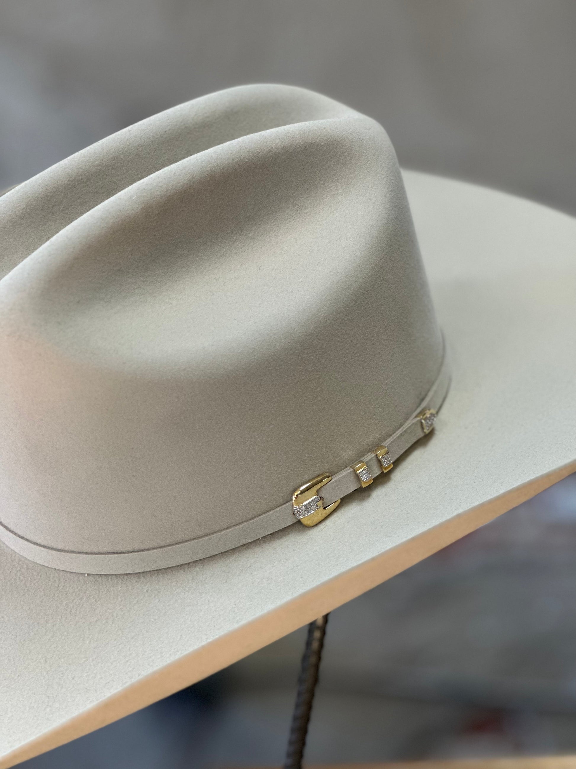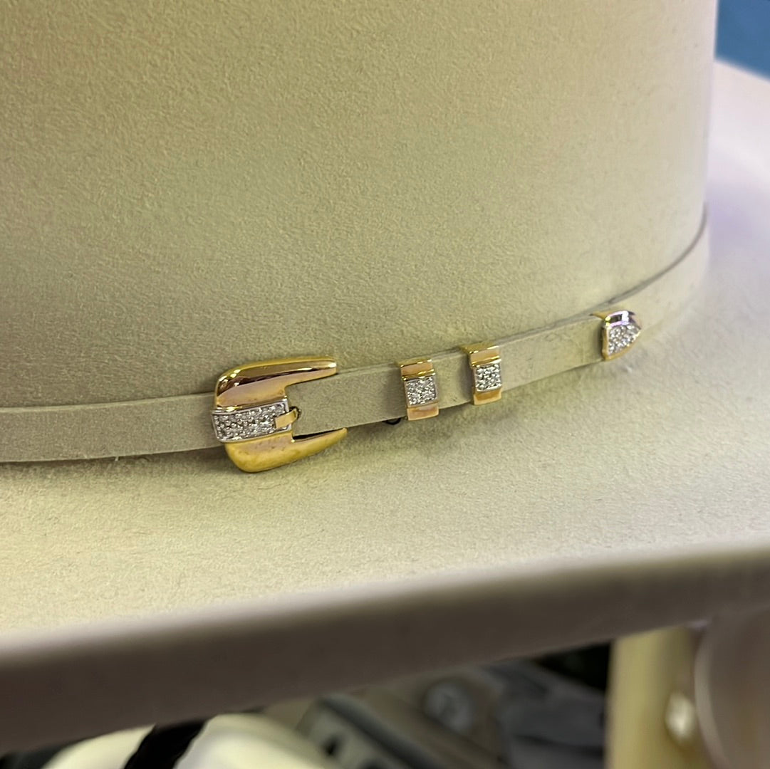 The Diamante, from Stetson Premier Collection, is one of a kind. This elegant 1000X Genuine Chinchilla and Beaver fur hat has a genuine sheepskin leather band. The band features a stunning 14K gold buckle and 26 Genuine Diamonds. As an added bonus, when you choose this hat you'll receive a Stetson tooled leather hatbox with a handle. Material: Genuine Beaver & Chinchilla Quality: 1000X